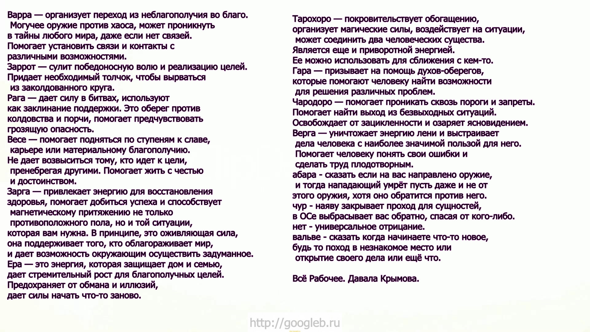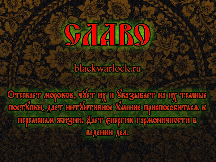 Слова – будет искоренять мороков, чуть их, и демонстрировать их плохие деяния. Также будет приносить интуитивные умения, и приспосабливаться к различным переменам в существовании. Придаёт энергетический заряд гармонии в начинаниях любых начинаниях.