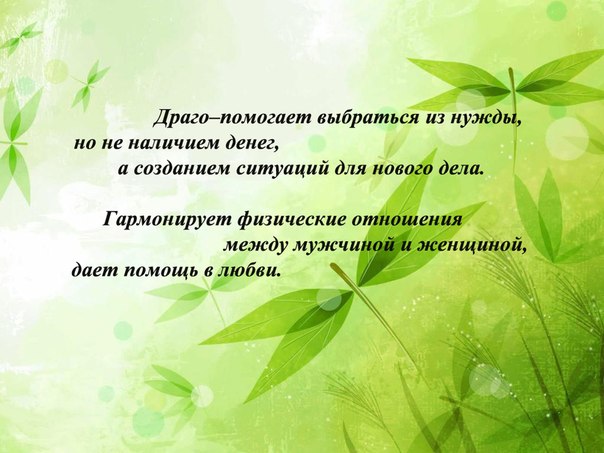 Драго – способна оказать помощь в выходе из различной нужды, но не касательно денежных средств, а способностью создать иное дело. Агма может уравновешивать отношения мужского пола и женского, и оказывает помощь в любовных утехах.